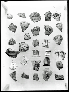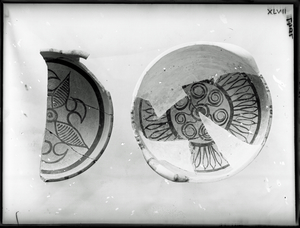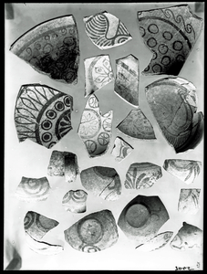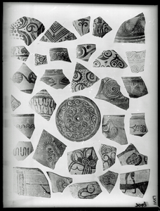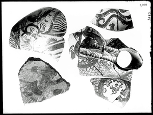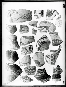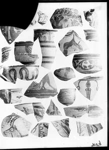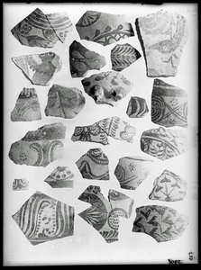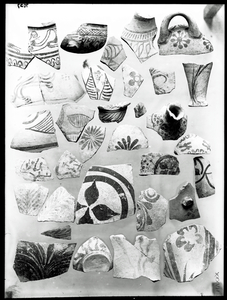 Part of a group of images from explorations and excavations on the island of Melos conducted by the British School at Athens from 1896 to 1899. The original description in the SPHS register reads: "Phylakopi: mostly black and red flowered fragments Phyl: pls.xxiii".