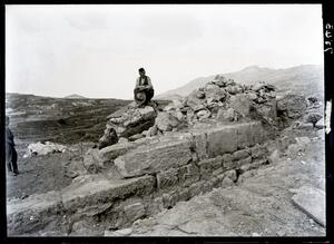 Part of a collection of images from the BSA excavations at Praisos, Crete in 1901. The original description in the SPHS register reads: "Praesos: wall of building on the saddle".