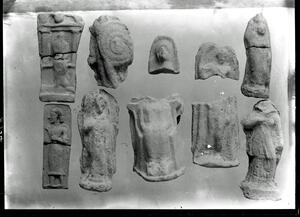 Part of a collection of images from the BSA excavations at Praisos, Crete in 1901. The original description in the SPHS register reads: "Praesos: terracottas from altar hill "Young God" back".