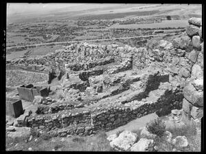 Part of a collection of images of the BSA's 1920s excavations at Mycenae. The original description in the SPHS negative register reads: "Mycenae, Granary from SE".