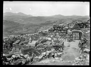 Part of a collection of images of the BSA's 1920s excavations at Mycenae. The original description in the SPHS register reads: "Mycenae: Lion gate from inside with granary to W.".