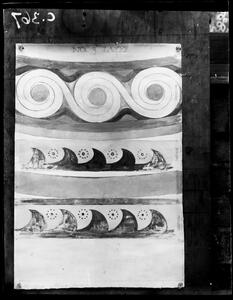 Watercolour drawing with an proposed reconstruction of a fresco with a spiral and lotus design, found by Tsountas near the Western portal. MYC 3/2/36 is included in 1936 Exhibition collection: 1936 EXH - 113.