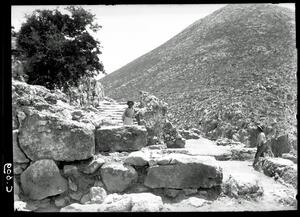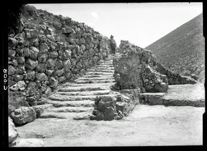 Part of a collection of images of the BSA's 1920s excavations at Mycenae. The original description in the SPHS negative register reads: "Mycenae, Palace great S. stairway from W".