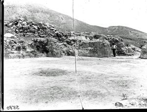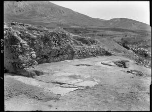 Part of a collection of images of the BSA's 1920s excavations at Mycenae. The original description in the SPHS negative register reads: "Mycenae, Palace court, W. side".