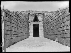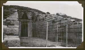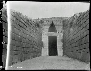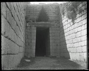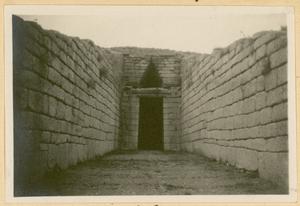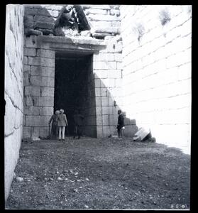 Part of a collection of images of the BSA's 1920s excavations at Mycenae. The original description in the SPHS negative register reads: "Mycenae, 'Treasury of Atreus' dromos and door".