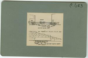 It is a preliminary section of the threshold of the Treasury of Atreus. It is drawn on cartridge paper and includes annotations. Because it is a preliminary sketch, it does not match exactly what was published in ABSA 25 and Wace, Mycenae no. 10b.
