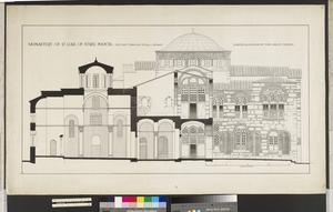 Longitudinal section of the Panagia church - North elevation of the Katholikon. The drawing is entitled in ink:'Monastery of St Luke of Stiris Phocis', 'Section through Small Church', 'North Elevation of the Great Church'.