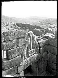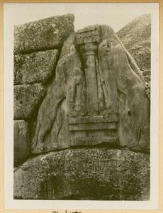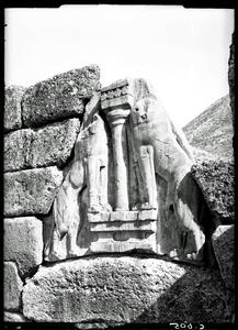 Part of a collection of images of the BSA's 1920s excavations at Mycenae. The original description in the SPHS negative register reads: "Mycenae, relief from N.E. (Lion Gate)".