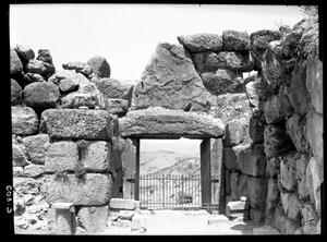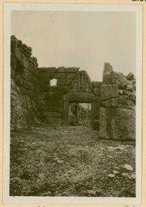 Part of a collection of images of the BSA's 1920s excavations at Mycenae. The original description in the SPHS register reads: "Mycenae: Lion gate from inside with granary to W.".