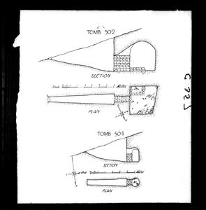 It is a preliminary sketch plan of the third kilometer cemetery and plans and sections of tombs 502, 504 & 505. It is drawn on cartridge paper and includes annotations. Because it is a preliminary sketch, it does not match exactly what was published in Archaeologia V. 82.