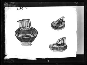Part of a collection of images of the BSA's 1920s excavations at Mycenae. The original description in the SPHS negative register reads: "Mycenae: vases from tomb 502". Recorded in the register as from the 1921 season.