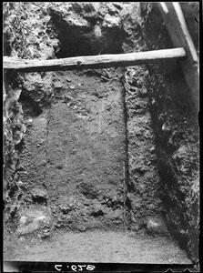 Part of a collection of images of the BSA's 1920s excavations at Mycenae. The original description in the SPHS negative register reads: "Mycenae: Tomb 504, door before opening". Recorded in the register as from the 1921 season.