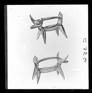 Part of a collection of images of the BSA's 1920s excavations at Mycenae. The original description in the SPHS negative register reads: "Mycenae: Tomb 518 long gem, stricken heifer, couchant beast (T529)". Recorded in the register as from the 1922 season.