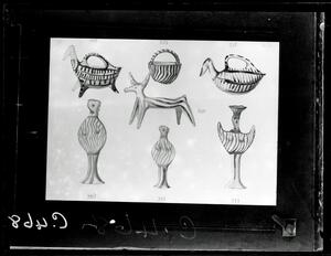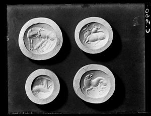 Part of a collection of images of the BSA's 1920s excavations at Mycenae. The original description in the SPHS negative register reads: "Mycenae: gems of animal forms". Recorded in the register as from the 1921 season.
