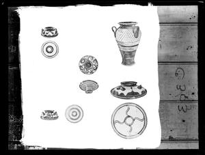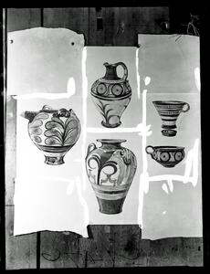 Part of a collection of images of the BSA's 1920s excavations at Mycenae. The original description in the SPHS negative register reads: "Mycenae: Tomb 518, vases 438, 286, 287, 264, 283". Recorded in the register as from the 1922 season.