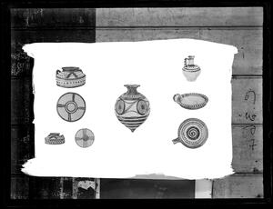 Part of a collection of images of the BSA's 1920s excavations at Mycenae. The original description in the SPHS negative register reads: "Mycenae: Tomb 518, vases 266, 269, 280, 265, 276". Recorded in the register as from the 1922 season.
