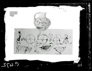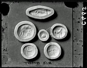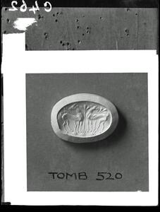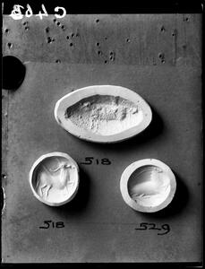 Part of a collection of images of the BSA's 1920s excavations at Mycenae. The original description in the SPHS negative register reads: "Mycenae: Tomb 518, long gem; lion regardant; peacock; wounded bull, Sicyon like dove; birds". Recorded in the register as from the 1922 season.