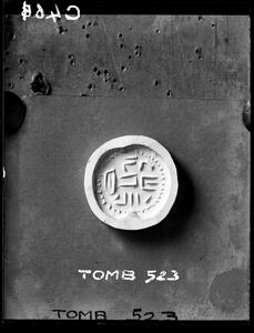 Part of a collection of images of the BSA's 1920s excavations at Mycenae. The original description in the SPHS negative register reads: "Mycenae: Tomb 523 gem with script". Recorded in the register as from the 1922 season.