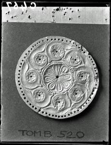 Part of a collection of images of the BSA's 1920s excavations at Mycenae. The original description in the SPHS negative register reads: "Mycenae: Tomb 520 disc". Recorded in the register as from the 1922 season.