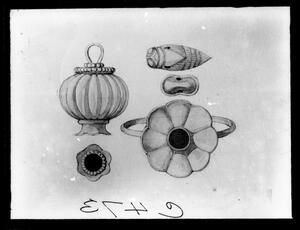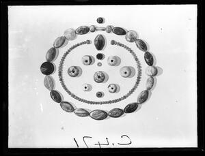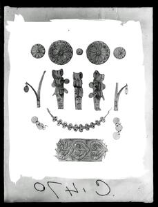 Part of a collection of images of the BSA's 1920s excavations at Mycenae. The original description in the SPHS negative register reads: "Mycenae: Tomb 518, jewels" Recorded in the register as from the 1922 season.