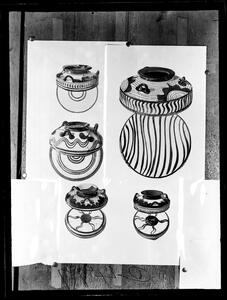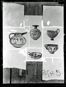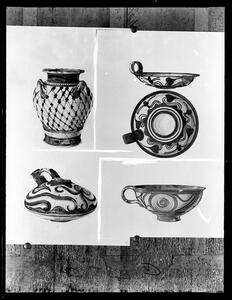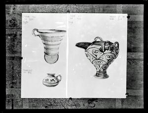 Part of a collection of images of the BSA's 1920s excavations at Mycenae. The original description in the SPHS negative register reads: "Mycenae: Tomb 532, vases 356, 369, 355" Recorded in the register as from the 1922 season.