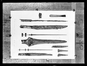 Part of a collection of images of the BSA's 1920s excavations at Mycenae. The original description in the SPHS negative register reads: "Mycenae: Tombs 518 & 529, daggers and blades". Recorded in the register as from the 1922 season.