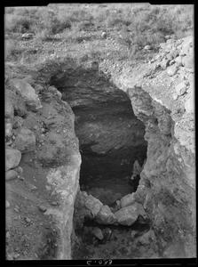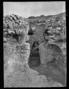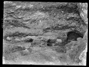 Part of a collection of images of the BSA's 1920s excavations at Mycenae. The original description in the SPHS negative register reads: "Mycenae, Tomb 524 pits in chamber NW". Recorded in the register as from the 1922 season.