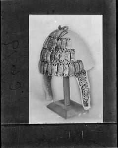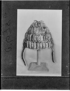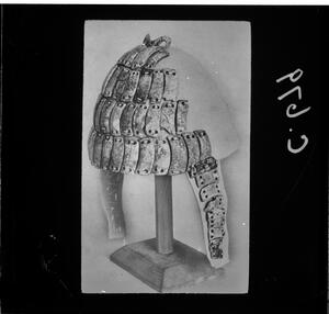 Part of a collection of images of the BSA's 1920s excavations at Mycenae. The original description in the SPHS negative register reads: "Mycenae, boars' tusk helmet reconstructed, 3/4 face view".