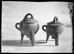 Part of a collection of images of the BSA's 1920s excavations at Mycenae. The original description in the SPHS negative register reads: "Mycenae, Tomb 532, incense pots". Recorded in the register as from the 1922 season.