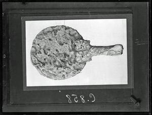 Part of a collection of images of the BSA's 1920s excavations at Mycenae. The original description in the SPHS register reads: "Bronze mirror from grave in dromos of tomb of Clytemnestra".