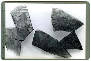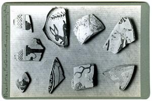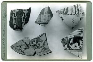Part of the collection of images, 1930-39, of the British School at Athens excavations at Perachora, Corinthia. The original description in the SPHS register reads: "Perachora proto-Corinthian fragments 7th century". No negative listed in the SPHS register.