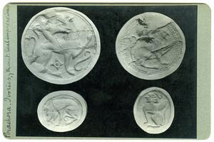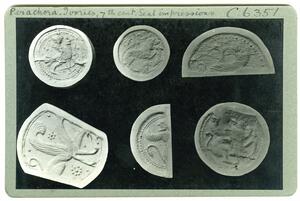 Part of the collection of images, 1930-39, of the British School at Athens excavations at Perachora, Corinthia. The original description in the SPHS register reads: "Perachora ivories, 7th century seal impressions". No negative listed in the SPHS register.