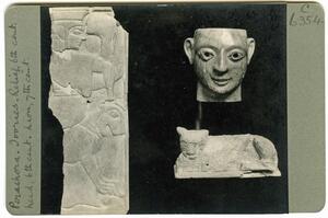 Part of the collection of images, 1930-39, of the British School at Athens excavations at Perachora, Corinthia. The original description in the SPHS register reads: "Perachora, ivory relief 6th century. Head 6th century. Lion 7th century". No negative listed in the SPHS register.