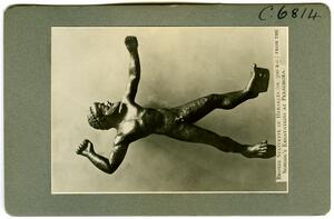 Part of the collection of images from the 1936 Exhibition of Minoan Civilization and the first 50 years work of the BSA at Burlington House, London. The object is from the 1930-39 excavations of the British School at Athens at Perachora, Corinthia. The original description in the SPHS register reads: "Bronze statuette of Herakles (ca. 500 BC), from Perachora".