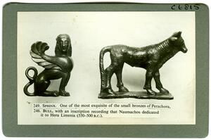Part of the collection of images from the 1936 Exhibition of Minoan Civilization and the first 50 years work of the BSA at Burlington House, London. The object is from the 1930-39 excavations of the British School at Athens at Perachora, Corinthia. The original description in the SPHS register reads: "(a) bronze Sphinx, (b) bronze bull with inscription from Perachora".