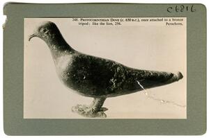 Part of the collection of images from the 1936 Exhibition of Minoan Civilization and the first 50 years work of the BSA at Burlington House, London. The object is from the 1930-39 excavations of the British School at Athens at Perachora, Corinthia. The original description in the SPHS register reads: "Proto-Corinthian bronze dove from Perachora, ca. 650 BC".