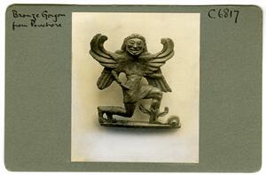 Part of the collection of images from the 1936 Exhibition of Minoan Civilization and the first 50 years work of the BSA at Burlington House, London. The object is from the 1930-39 excavations of the British School at Athens at Perachora, Corinthia. The original description in the SPHS register reads: "Bronze Gorgon from Perachora".