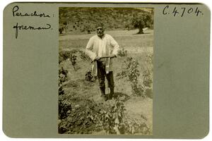 Part of the collection of images, 1930-39, of the British School at Athens excavations at Perachora, Corinthia. The original description in the SPHS register reads: "Perachora: foreman with drill for sounding for tombs".