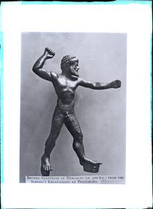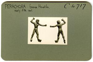 Part of the collection of images, 1930-39, of the British School at Athens excavations at Perachora, Corinthia. The original description in the SPHS register reads: "Perachora: bronze Herakles, early 5th century".