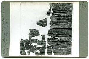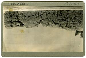 Part of the collection of images, 1930-39, of the British School at Athens excavations at Perachora, Corinthia. The original description in the SPHS register reads: "Perachora inscription Retrograde, from sacrificial pit in Temple of Hera Limenia". No negative listed in the SPHS register.