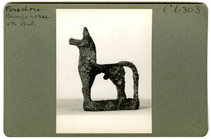 Part of the collection of images, 1930-39, of the British School at Athens excavations at Perachora, Corinthia. The original description in the SPHS register reads: "Perachora bronze horse 8th century". No negative listed in the SPHS register.