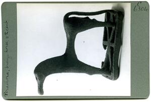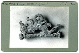 Part of the collection of images, 1930-39, of the British School at Athens excavations at Perachora, Corinthia. The original description in the SPHS register reads: "Perachora bronze beltclasp 7th century". No negative listed in the SPHS register.