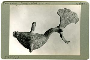 Part of the collection of images, 1930-39, of the British School at Athens excavations at Perachora, Corinthia. The original description in the SPHS register reads: "Perachora bronze bird 8th century".