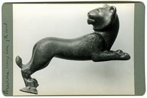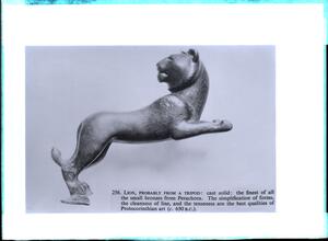 Part of the collection of images, 1930-39, of the British School at Athens excavations at Perachora, Corinthia. The original description in the SPHS register reads: "Perachora bronze lion 7th century rampant regardant". No negative listed in the SPHS register.