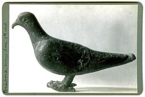 Part of the collection of images from the 1936 Exhibition of Minoan Civilization and the first 50 years work of the BSA at Burlington House, London. The object is from the 1930-39 British School at Athens excavations at Perachora, Corinthia. The original description in the SPHS register reads: "Proto-Corinthian bronze dove from Perachora, ca. 650 BC".