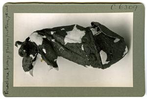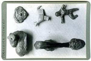 Part of the collection of images, 1930-39, of the British School at Athens excavations at Perachora, Corinthia. The original description in the SPHS register reads: "Perachora bronze sphinx + bull: bull inscribed by Naumachos to Hera Limenia". No negative listed in the SPHS register.
