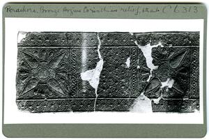 Part of the collection of images, 1930-39, of the British School at Athens excavations at Perachora, Corinthia. The original description in the SPHS register reads: "Perachora bronze Argive Corinthian relief 6th century (chariots)". No negative listed in the SPHS register.