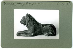 Part of the collection of images, 1930-39, of the British School at Athens excavations at Perachora, Corinthia. The original description in the SPHS register reads: "Perachora bronze lion 6th century couchant". No negative listed in the SPHS register.