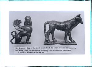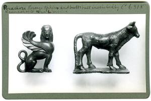 Part of the collection of images from the 1936 Exhibition of Minoan Civilization and the first 50 years work of the BSA at Burlington House, London. The objects are from the 1930-39 British School at Athens excavations at Perachora, Corinthia. The original description in the SPHS register reads: "(a) bronze Sphinx, (b) bronze bull with inscription from Perachora".