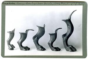 Part of the collection of images, 1930-39, of the British School at Athens excavations at Perachora, Corinthia. The original description in the SPHS register reads: "Perachora bronze lion legs from bowls 6th+5th centuries".